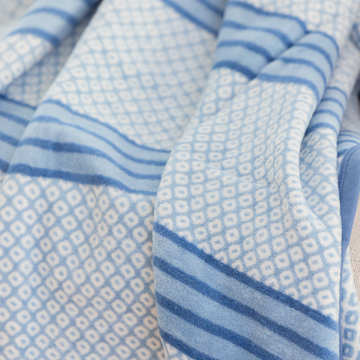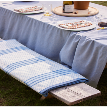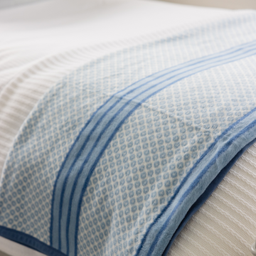 A classic New England birdseye pattern meets blue-on-blue stripes for an eye-catching design that makes a bold and memorable warm-weather statement, from sand to sofa.