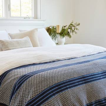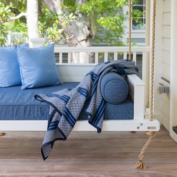 A classic New England birdseye pattern meets blue-on-blue stripes for an eye-catching design that makes a bold and memorable statement, from porch swing to sofa.